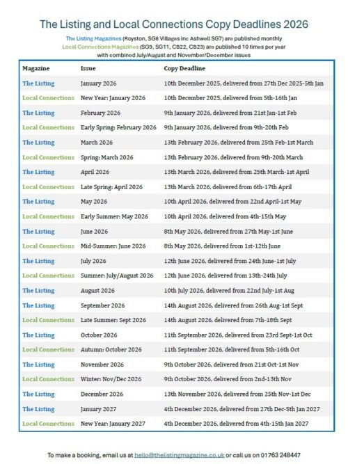 The Listing Magazines (Royston, SG8 Villages inc Ashwell SG7) are published monthly