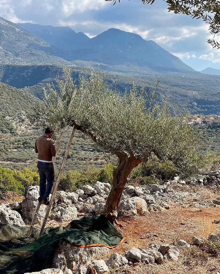 Their olives grow in the Mani beneath the Taygetos Mountains, overlooking the Messinian Gulf near the historic village of Kardamilli. The centuries-old Koroneiki trees are naturally cultivated and hand-harvested before being cold-pressed to preserve flavour and nutritional value.