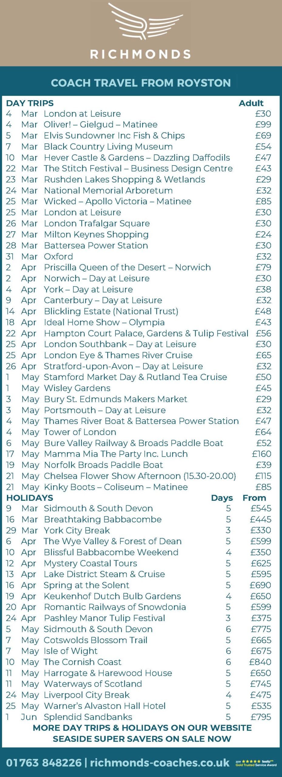 Richmonds runs a popular programme of day trips and holidays to resorts, attractions, theatres, and exhibitions, with convenient pick-up points across Cambridgeshire and Hertfordshire.