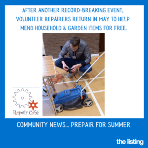 There are 30 places available for items to be assessed for a free fix. Suitable items are mainly household and garden items – if you can carry it, repairers will probably be able to take a look. Successes back in February included a lawnmower, two sewing machines, and three Christmas decorations.