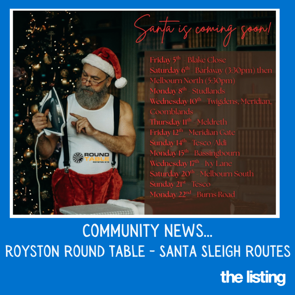 The sleigh bells are jingling, the music is ready, and Santa can’t wait to see you all. Keep an ear out and come give him a wave as he visits Royston and villages.